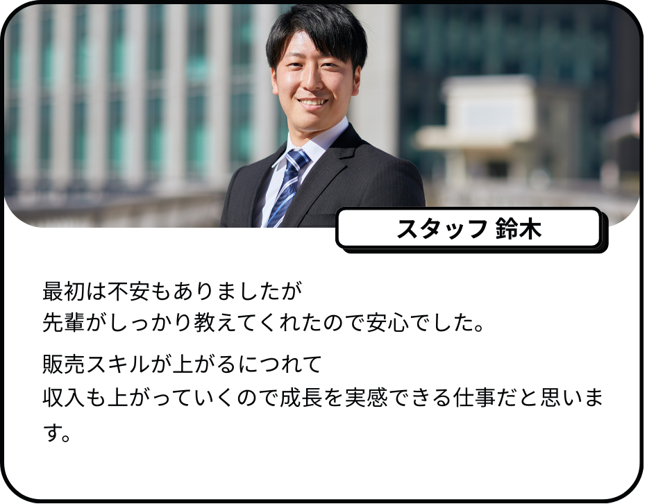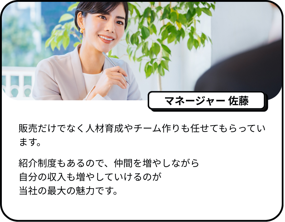販売スキル・営業スキル・マネジメントスキルを身につけながらキャリアアップしていくことが可能です。